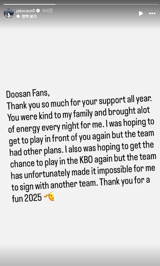 [제이크 케이브 인스타그램 캡처] 외국인 타자 제이크 케이브가 프로야구 두산 베어스와의 재계약에 실패한 가운데 본인 SNS를 통해 팬들에게 메시지를 남겼습니다. 이 메시지에는 소속 구단의 허락이 없으면 다음 시즌 KBO 리그에서 뛸 수 없는 제도에 대한 아쉬움도 포함되어 있었습니다. 케이브는 오늘(27일) 본인의 인스타그램에 \"1년 내내 내게 보내준 팬들의 성원에 감사하다\"며 \"우리 가족에게 친절을 베풀어주었고, 나에게 매일 에너지를 주었... 현황